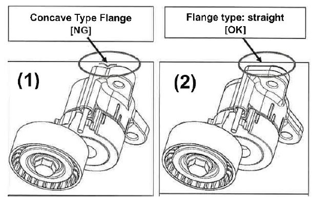 I've also attached an image showing the new tensioner which has a stronger flange. Access is via right wheel removal and removal of the plastic wheel well splash guard.